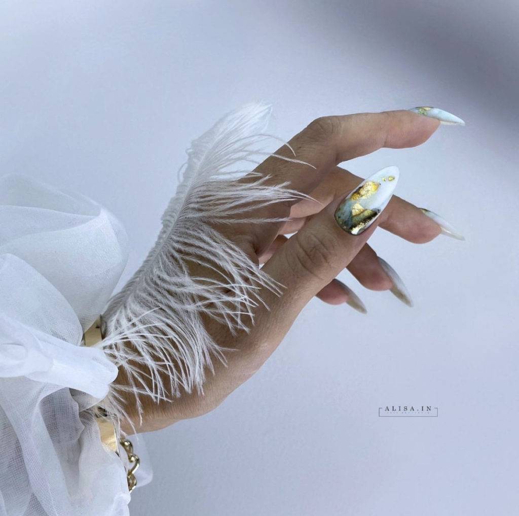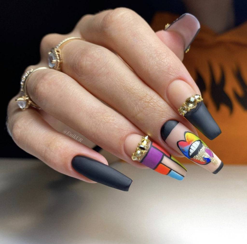 Броская абстракция завоевала списки модных трендов не только в фэшн-индустрии, но и в мире маникюра. Не бойтесь сочетать красочные оттенки и яркий декор. Тандем белого горошка, космических разводов и разнообразных линий — все это смотрится круто и новомодно. С таким дизайном вы будете выглядеть суперстильно и молодежно.
