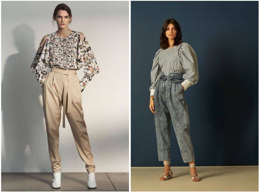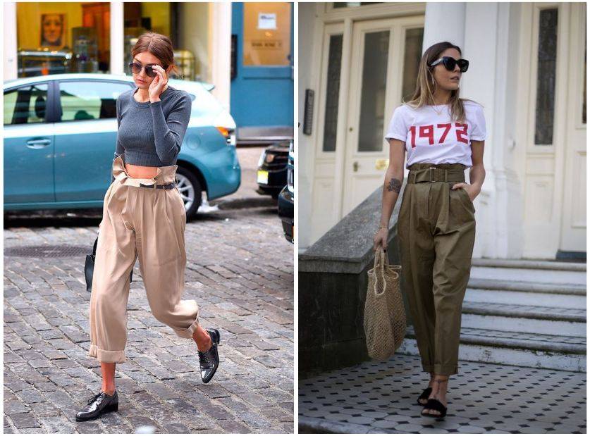 Штаны с завышенной талией также находятся на пике популярности. Пояс в данном случае становится своеобразным корсетом, под которым прячется немного выступающий животик. Крой при этом бывает как немного обтягивающий, так и свободный.