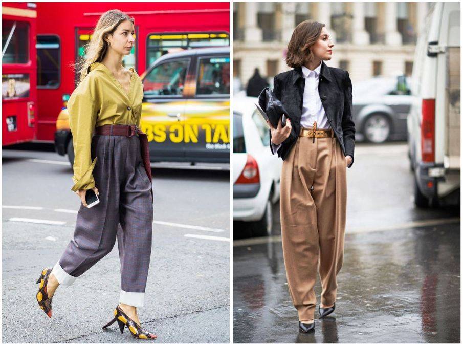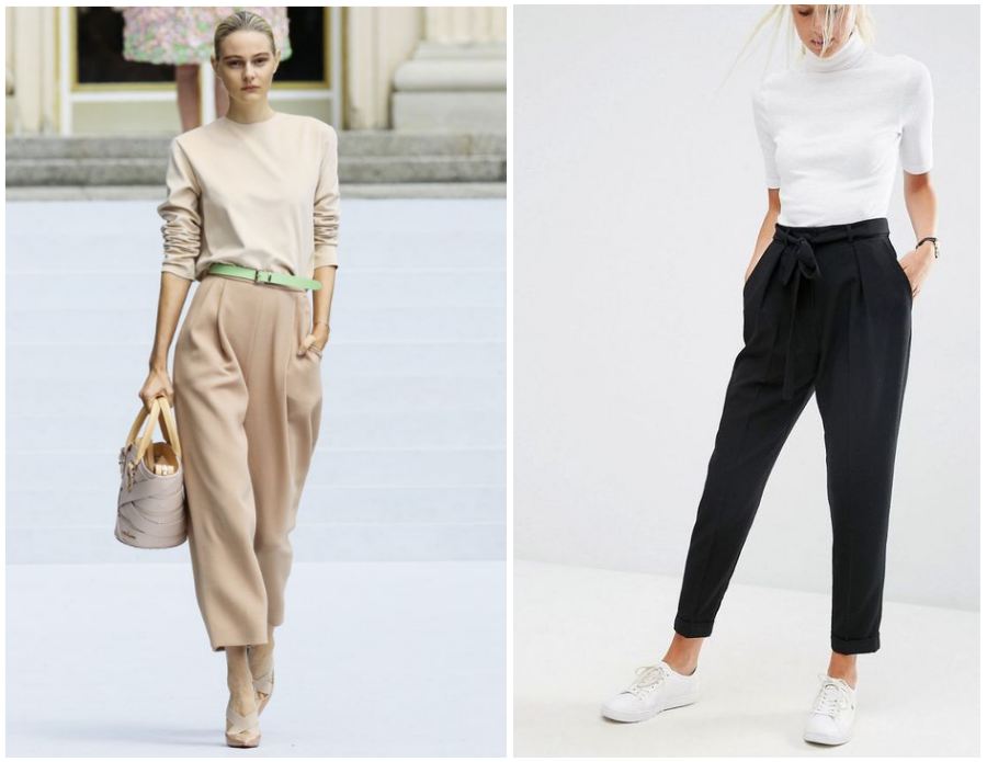 - Штаны напоминают о моде 80-х своим кроем – широкие в бедрах и зауженные к низу.