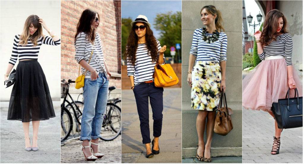 Узкие укороченные брючки с тельняшкой оверсайз будут идеально выглядеть на стройной девичьей фигуре. Приталенная тельняшка с коротким рукавом хорошо смотрится с джинсами клёш. Дополнить их можно пиджаком в тон брюк. Майка-тельняшка с шортами, сандалиями и лёгким рюкзачком — чудесный лук для отпуска. Длинная юбка с тельняшкой-топом будут хороши для вечернего променада. Комбинировать можно до бесконечности. Добавляйте всевозможные аксессуары; дополняйте образ шляпками, панамами, косынками; используйте разную обувь: кеды, балетки, кроссовки, мокасины, сабо, слипоны, эспадрильи, босоножки с открыми пятками и носками, туфли с каблуками разной высоты.