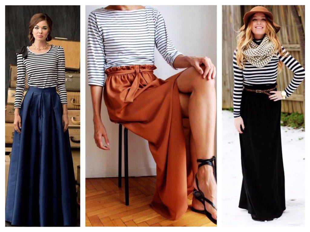 Ещё одно беспроигрышное сочетание — юбка в пол и тельняшка. Экспериментировать здесь можно до бесконечности — в покрое, цветовой гамме, с тельняшками разных фасонов, применяя аксессуары и дополняя другими предметами одежды, например пиджаками, куртками, плащами, летними пальто.