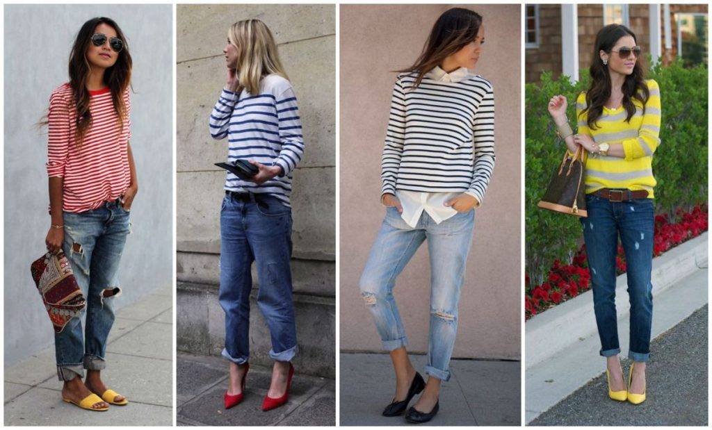 Сегодня у редкой девушки в гардеробе которой нет джинсов. Тельняшки до половины бедра отлично сочетаются с джинсами типа скинни, под «дудочки» лучше подобрать удлиненный приталенный вариант (можно очертить линию талии, используя пояс). Прекрасно смотрятся бойфренды, если сочетать их с матроской и жилеткой сверху.