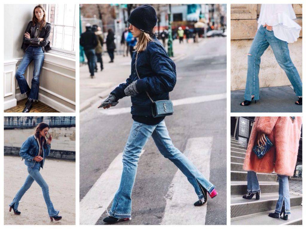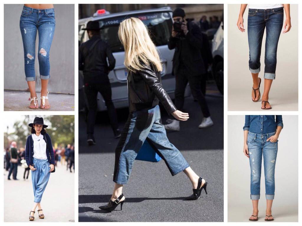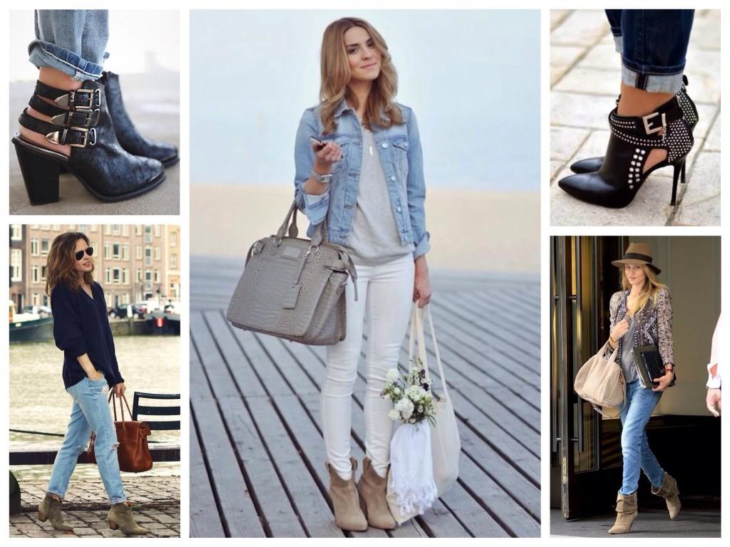 Особенно стильно укороченные джинсы смотрятся с ботинками в варианте клёш. Под них лучше надевать вышеупомянутые остроносые ботильоны на низкой шпильке, но также стильно будут смотреться и любые другие виды.