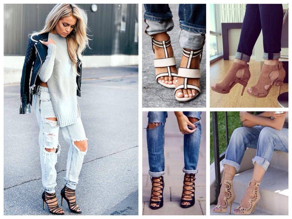 Джинсы с рваным краем с моделями туфель на ремешке