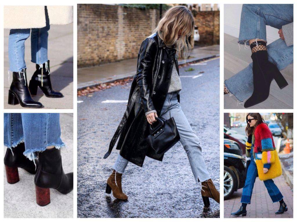 Данное сочетание больше подходит для осени или весны, зимой же лучше укороченные джинсы носить с высокими ботинками, хотя бы из соображений удобства и комфорта. Так, идеально с укороченными джинсами будут смотреться ботильоны-носки.