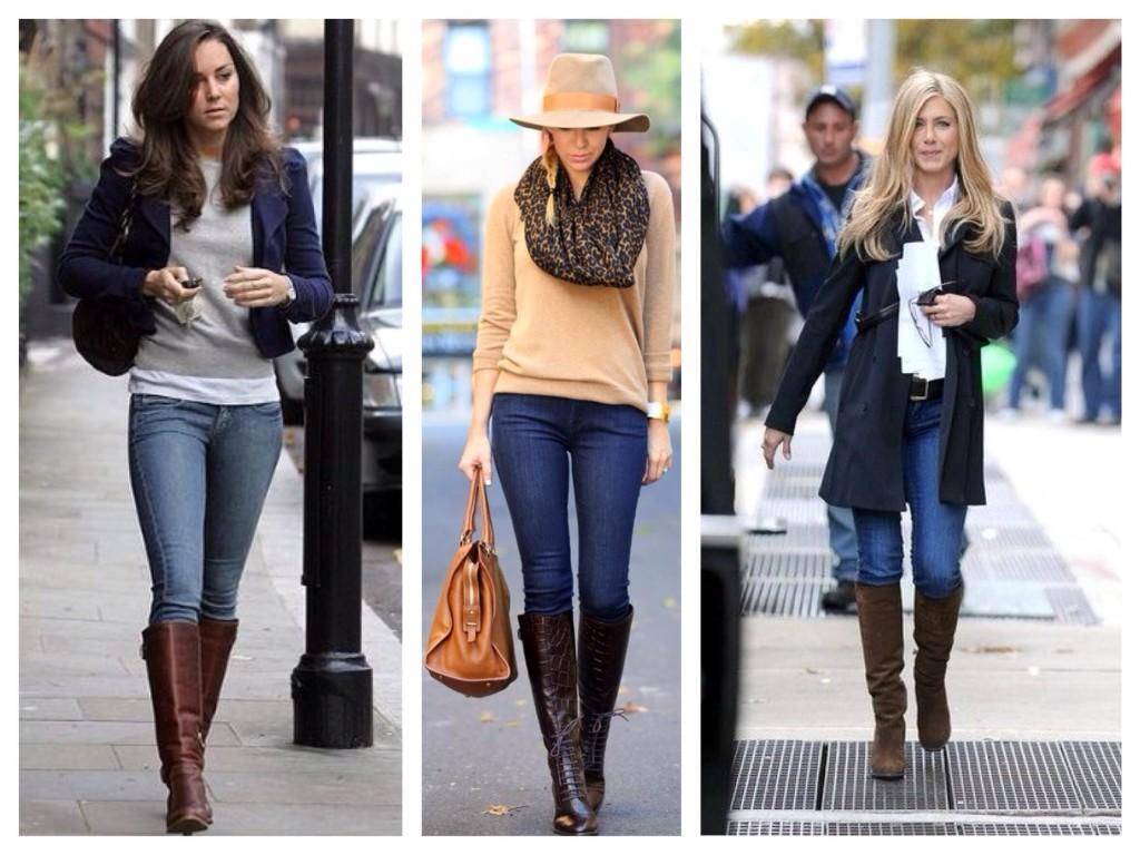 - В осенне-зимний период обладательницам стройных форм выгодно подчеркнет фигуру сочетание сапог с джинсами, но самым удобным вариантом будут теплые угги.