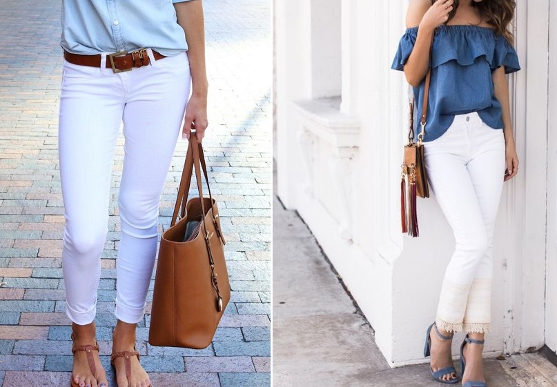 Весна и лето – лучшее время для светлых брюк. Белые джинсы с прорезями на коленях в паре с классической тельняшкой и курткой из денима – то, что нужно для прохладных весенних вечеров. жинсовую рубашку всегда сложно “подружить“ с другими вещами из денима, но белые джинсы вне конкуренции. Добавим немного женственности. Укороченные белые джинсы + блузка с принтом + каблук = идеальный ансамбль для свидания.