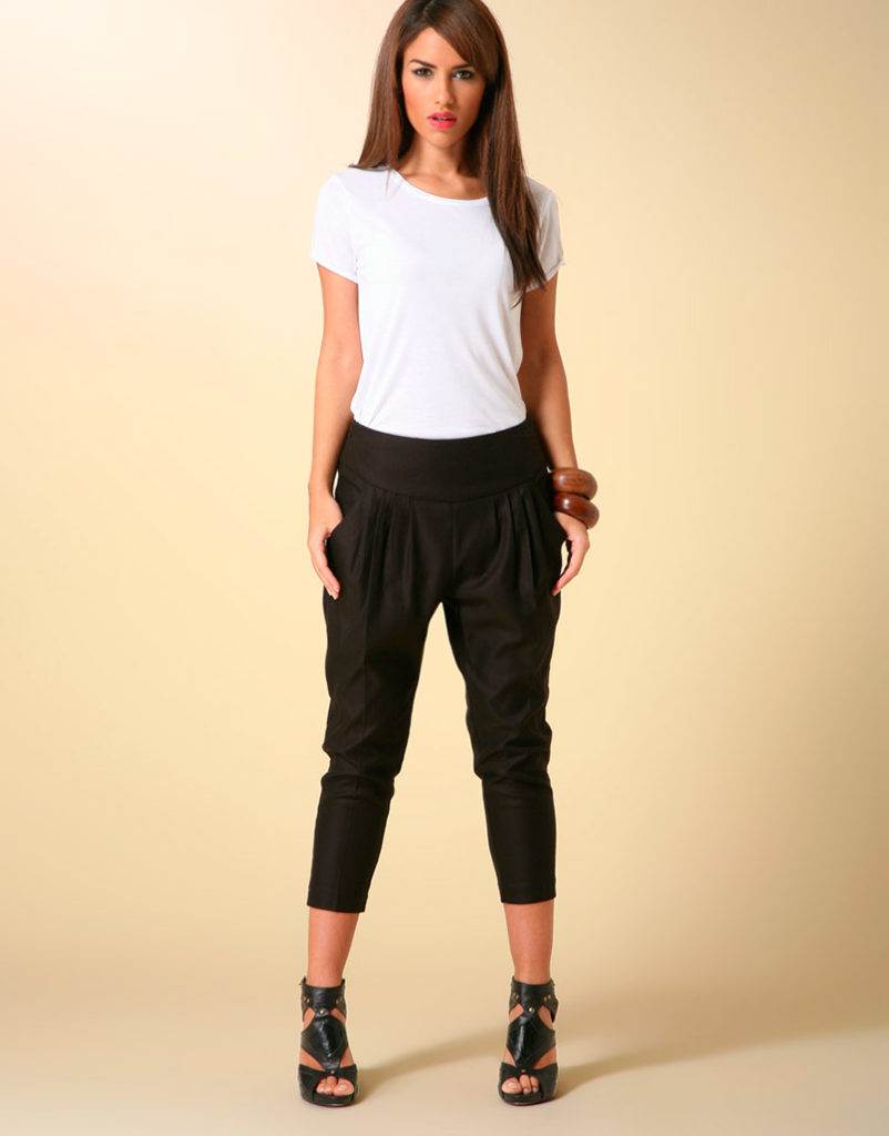 Пошить такие стильные брюки своими руками проще простого. Выбирая ткани, в качестве основы можно отдать предпочтение натуральному хлопку, льну и даже джинсовой ткани. Традиционно такие штаны шьются из светлых тканей. Трикотажные штаны в восточном стиле с низкой мотней идеально подойдут для занятий спортом или танцами.