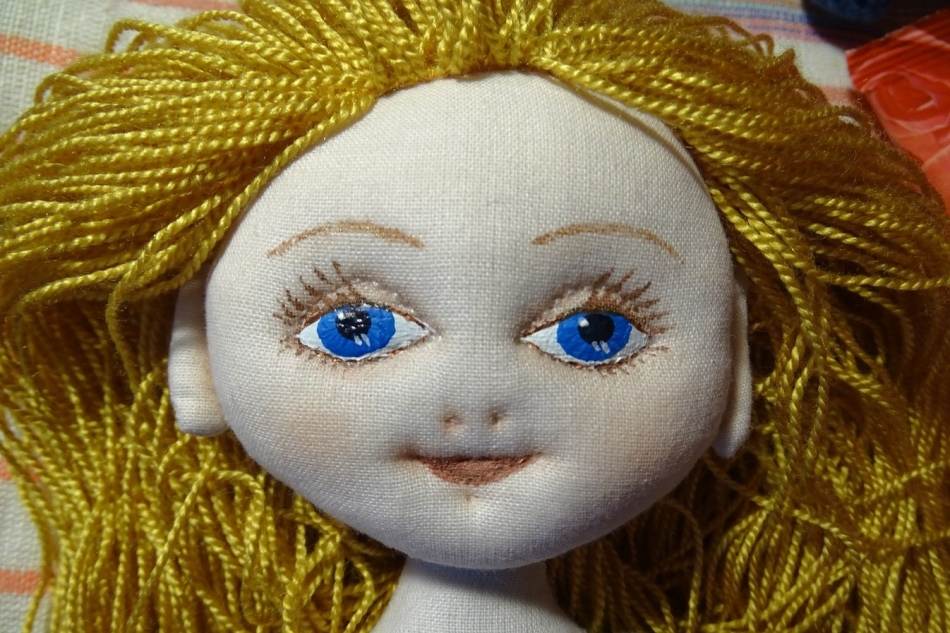 - Пришейте кукле парик, приготовленный заранее.