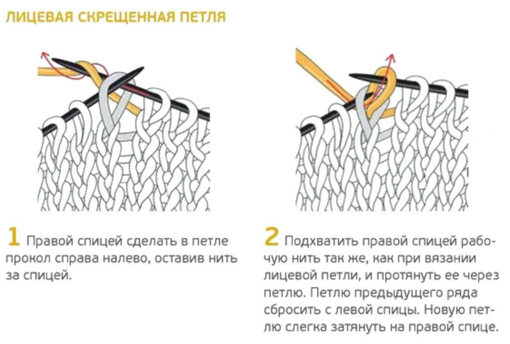 - Во втором ряду предстоит провести увеличение в два раза числа петель. Из одно, при этом, вывязывается одна лицевая и одна лицевая скрещенная;
