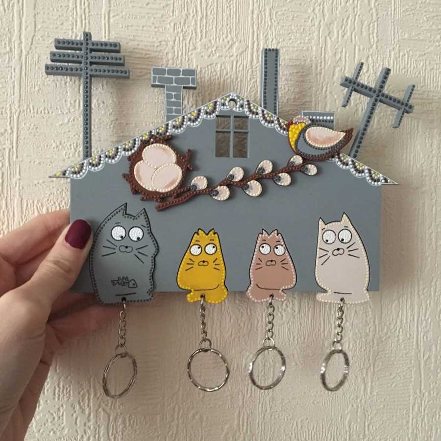 Прекрасным акцентом в прихожей станет ключница, выполненная своими руками. Наиболее простой вариант — скрепить вместе несколько досок, покрасить, покрыть лаком, установить крючки. В качестве декора можно использовать декупажные карты, чипборды, гальки, камни и ракушки.