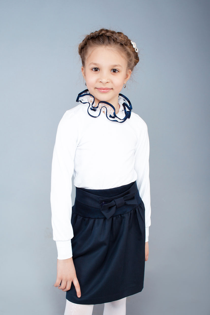 Белая блуза для девочки может быть прямой, без воланов, рюш, манжета. Это вариант для дополнения яркого школьного сарафана. Ее можно заправить в юбку. А процесс шитья будет простым. Такие модели обязательно дополняют интересными деталями. Это может быть брошь, бантик или другой аксессуар. Или кофта, которая будет поверх блузы. Если планируется праздничная модель — усложняют крой. Делают ее приталенной. Дополняют манжетой, воланами снизу, красивым воротничком. Отличным дополнением становиться жабо