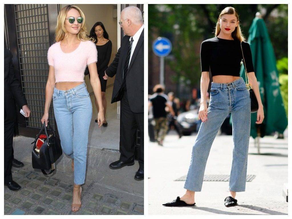 Хорошо сочетаются mom jeans + короткий топ или свитшот.