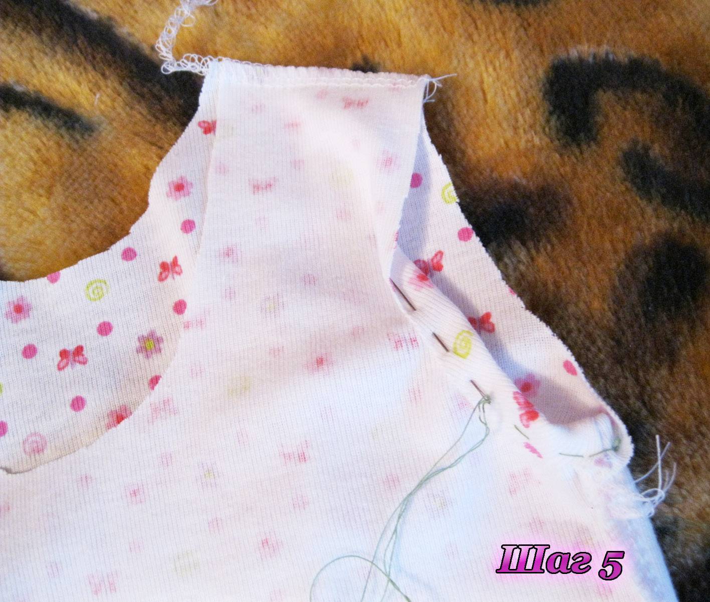 - Стачиваем плечевые швы: заднюю и переднюю части изделия складываем и сшиваем на машинке, отступая от края 1,5 см.