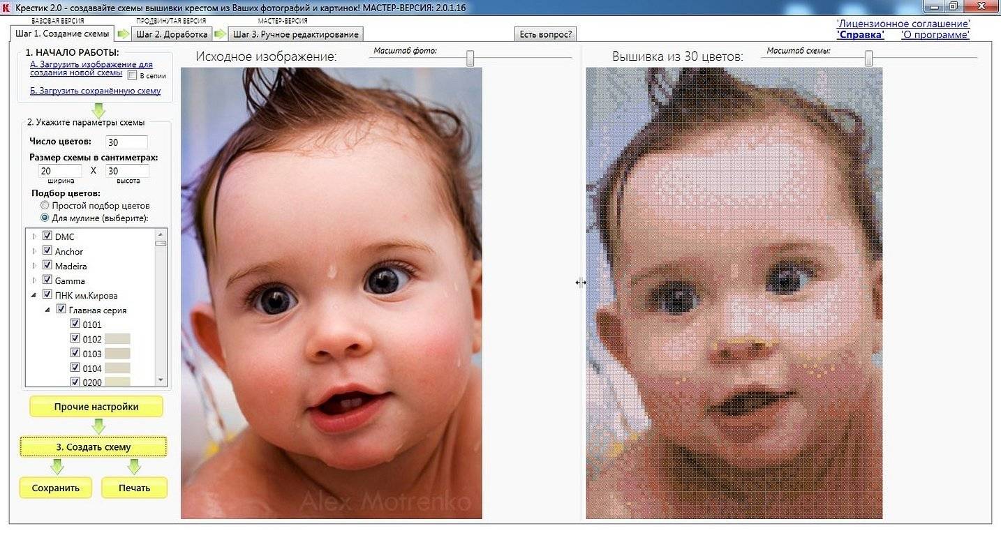 Программа удобна в освоении и работе. Даже при простом прогоне она позволяет получить достаточно хорошую графическую основу, у которой будет минимум погрешностей. Если потратить еще немного времени на доработку полученного результата, на выходе будет высококачественная схема, к которой останется только купить материалы. В программе имеется палитра всех основных производителей мулине, а также шерсти для вышивки фирмы Риолис.