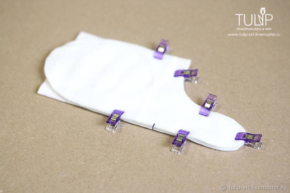 Начнем работу с соединения деталей задней, ладонной стороны варежек. Первым делом необходимо сформировать пальчик. Для этого складываем детали лицевыми сторонами друг к другу, как показано на фото и скрепляем булавками или клипсами