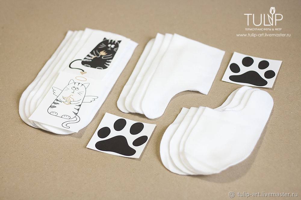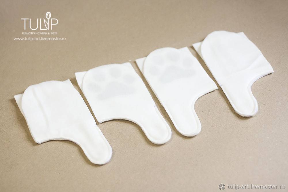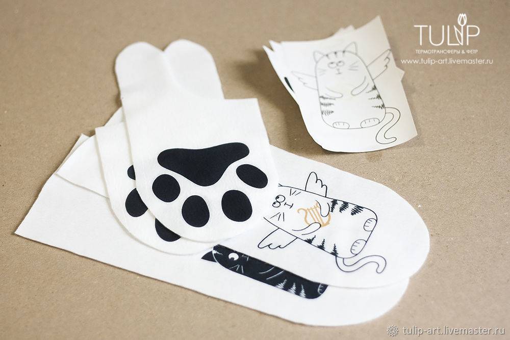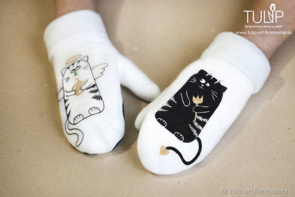 Распечатываем выкройку и выкраиваем все необходимые детали. Декорировать варежки котиками и лапками будем, как обычно, используя мои любимые сублимационные термонаклейки.