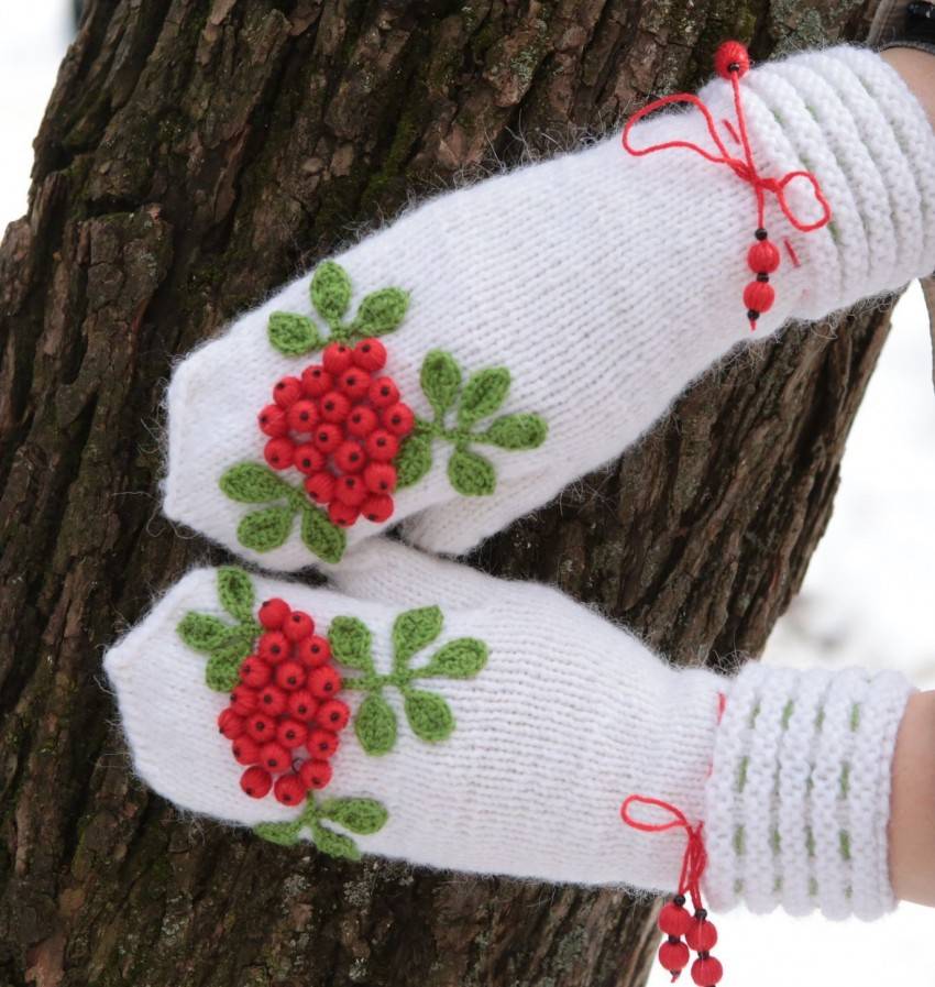 Схемы вышивки легко найти в интернете или создать самим. Небольшие эскизы подойдут для варежек, самые популярные из них: снежинки, снегири, гроздья ягод или орнаменты.