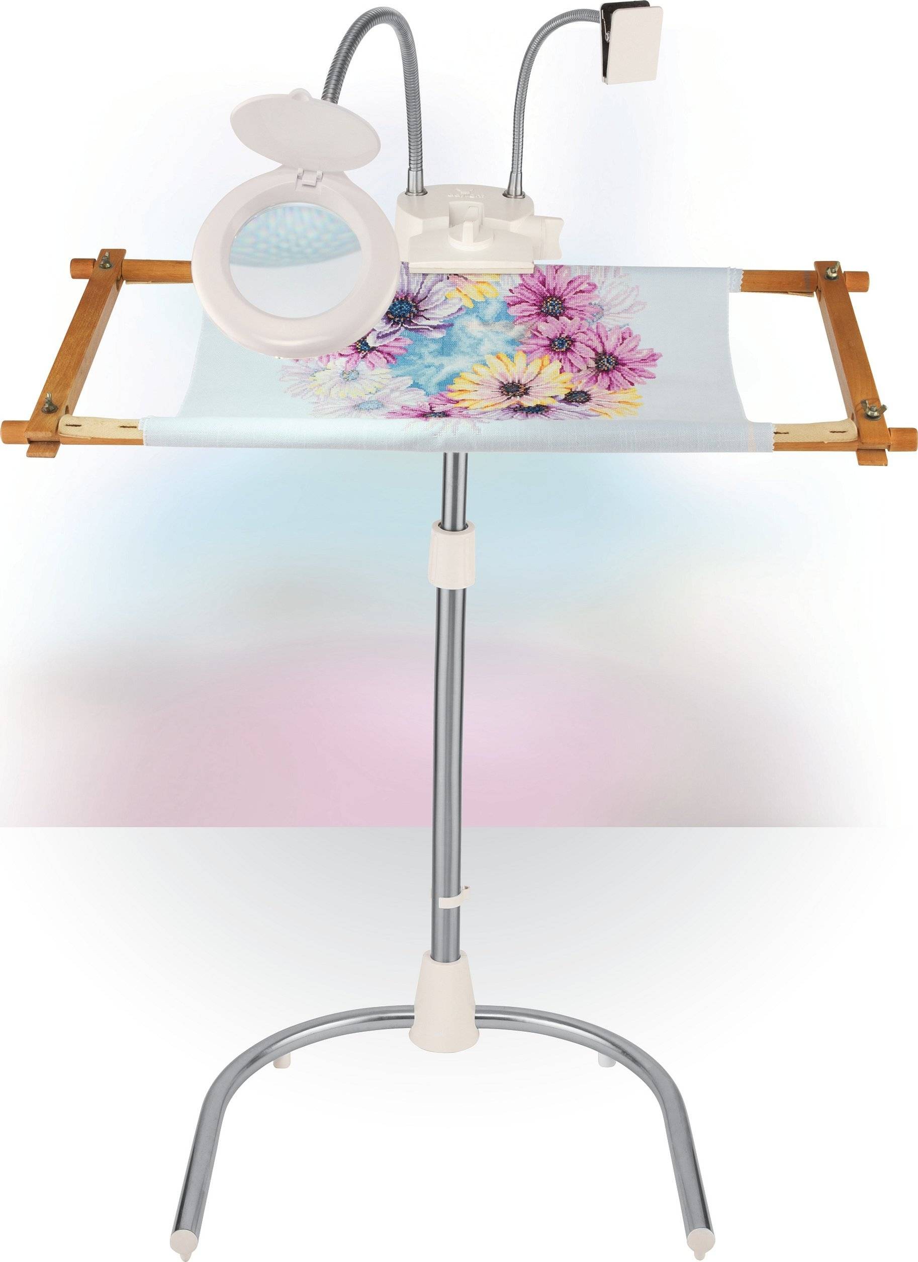 Для больших объемов работ удобны настольные станки, которые способствуют меньшему напряжению шеи и рук, плечевого пояса. Конструкцию можно регулировать во всех направлениях для удобства положения полотна. Оснащенные лупами, такие станки позволят делать вышивку на черной канве или ткани, комбинировать неконтрастные тона, тщательно выверять и делать четкие стежки. Настольный станок может быть и круглым, и квадратным, и прямоугольным.