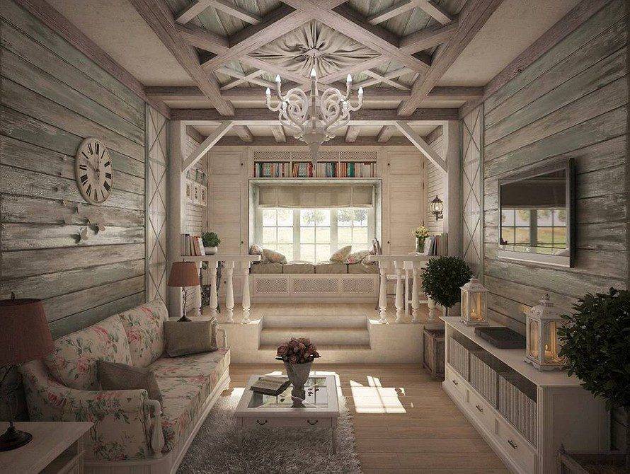Дизайн гостиной в стиле прованс предполагает отделку потолка с помощью деревянных балок. Этот вариант больше подойдет для частного коттеджа, а в условиях городской квартиры рельеф бревен можно имитировать с использованием полиуретановых поверхностей.