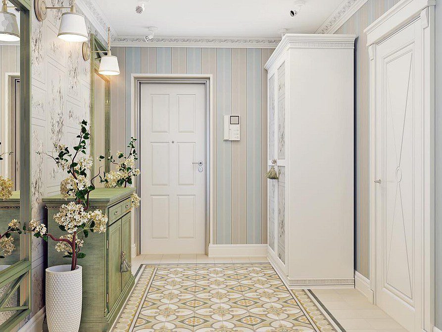 Необычным интерьерным решением станет отделка стен камнем. Напольное покрытие так же выполняют из камня или ламината. Светлые оттенки отделки и мебели сделают прихожую просторнее. Не стоит размещать современный шкаф-купе, гармоничнее будет смотреться вместительный винтажный шкаф с состаренным эффектом. Зеркало в прихожей украсит деревянная рама той же техники отделки, что и шкаф.