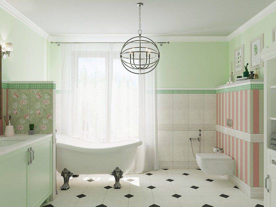 Отделка ванной и туалета в стиле прованс традиционно выполняется в светлых тонах. Кафельная плитка может быть однотонной или с легким цветочным узором. Так же гармонично смотрится плитка с эффектом старины и потертостей. Полезную функцию в интерьере ванной выполняют плетеные корзины и кованые этажерки.