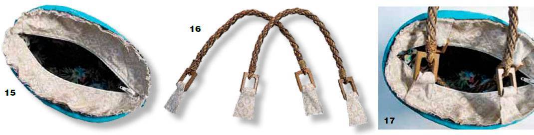 15. Настрачиваем петли с ручками на верхний срез сумочки со стороны застежки (17).