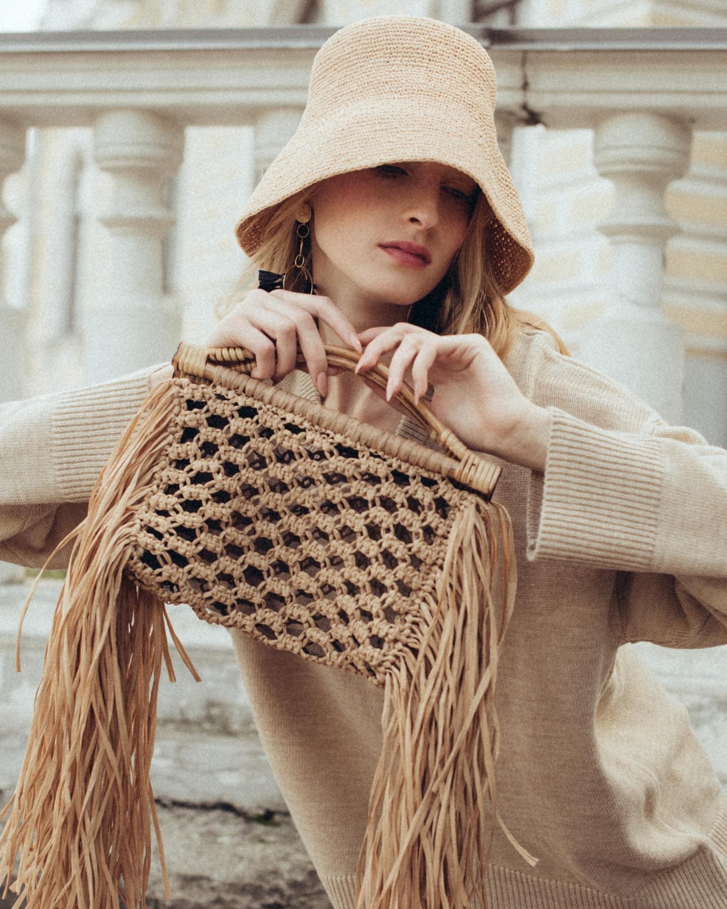Натуральный материал приятного оттенка смотрится уютно и колоритно, он очень прочный и устойчив к деформации, чего не скажешь, например, о сумках из плетеного трикотажа.