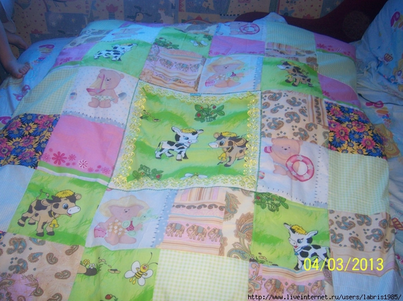 Отдельные элементы настрачивают на цельное полотно. В этой технике не нужно составлять одеяло с нуля. Подойдет любое старое покрывало.