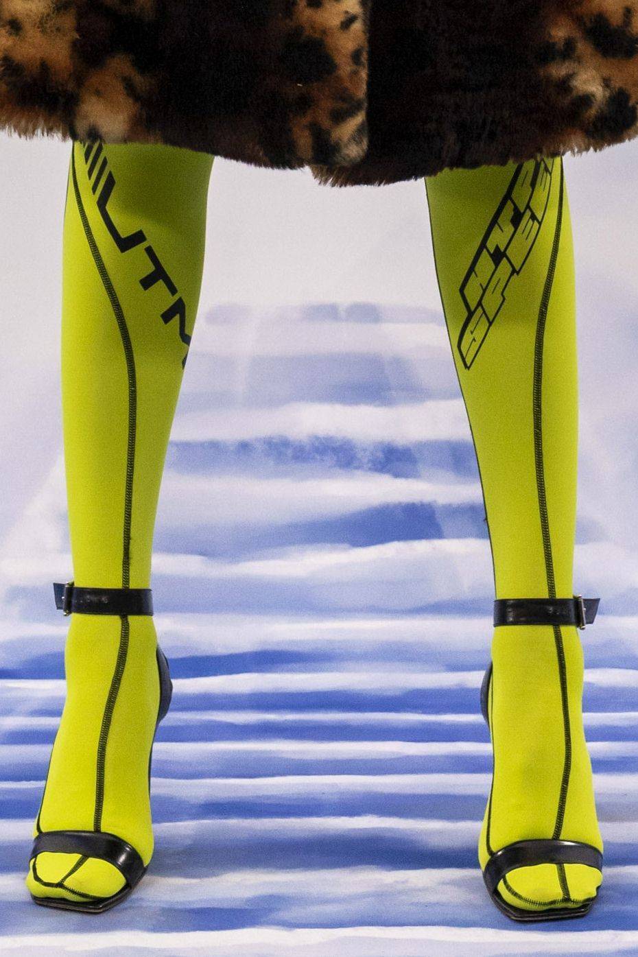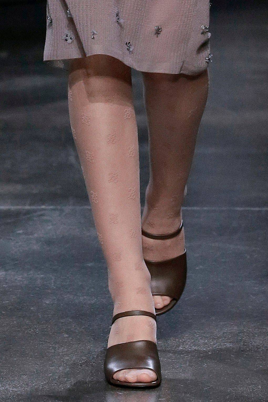 Полупрозрачные цветные колготки значительно уступают в популярности плотным собратьям. Тем не менее на плаву держатся и нейтральные оттенки, как у Anrealage и PH5, и колоритные версии, представленные на показе Feng Chen Wang. Аналогичная ситуация у экземпляров с рисунками: Fendi и Nina Ricci дополняют наряды базовыми капронками, а Versace — веселенькими.
