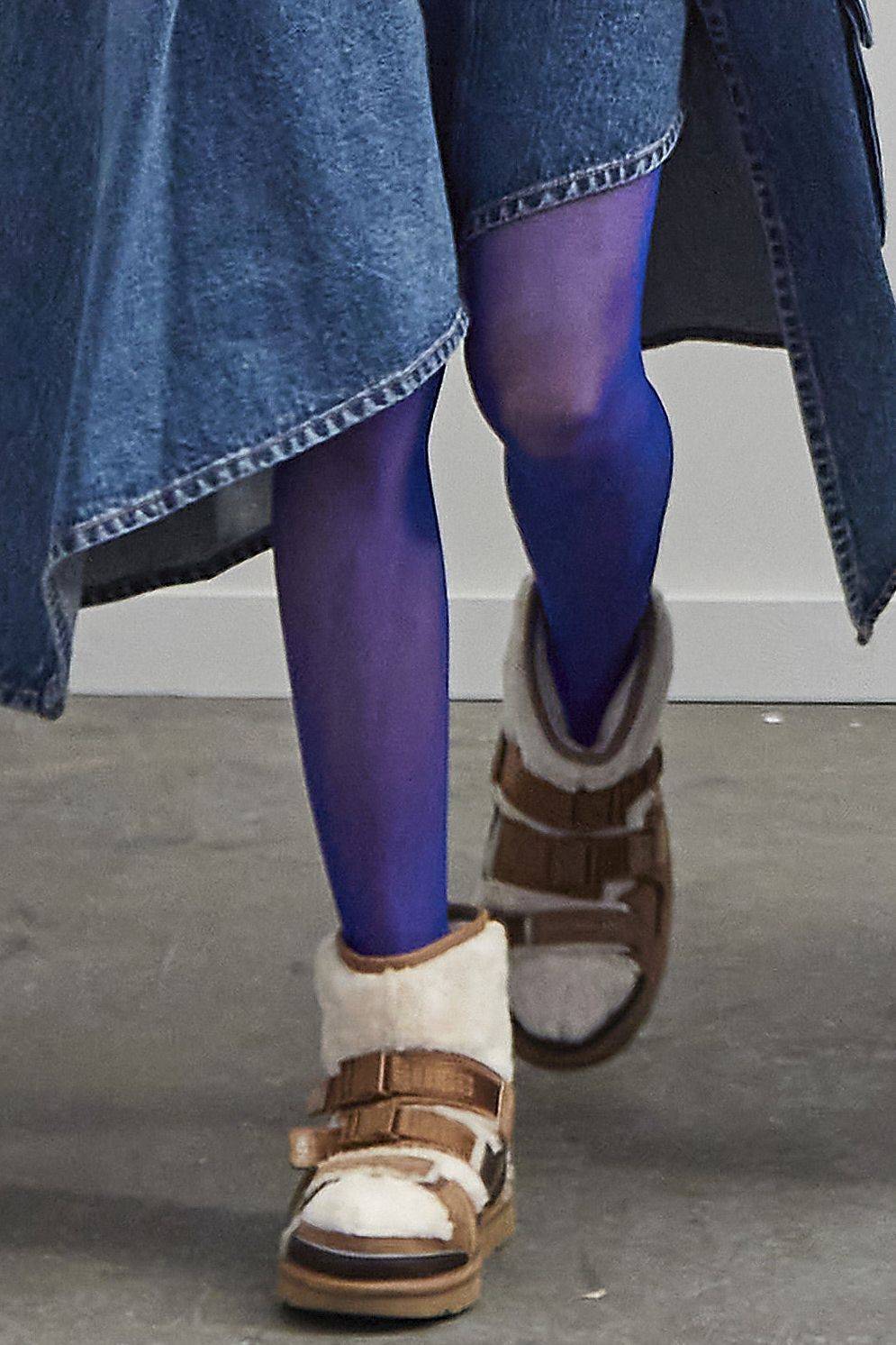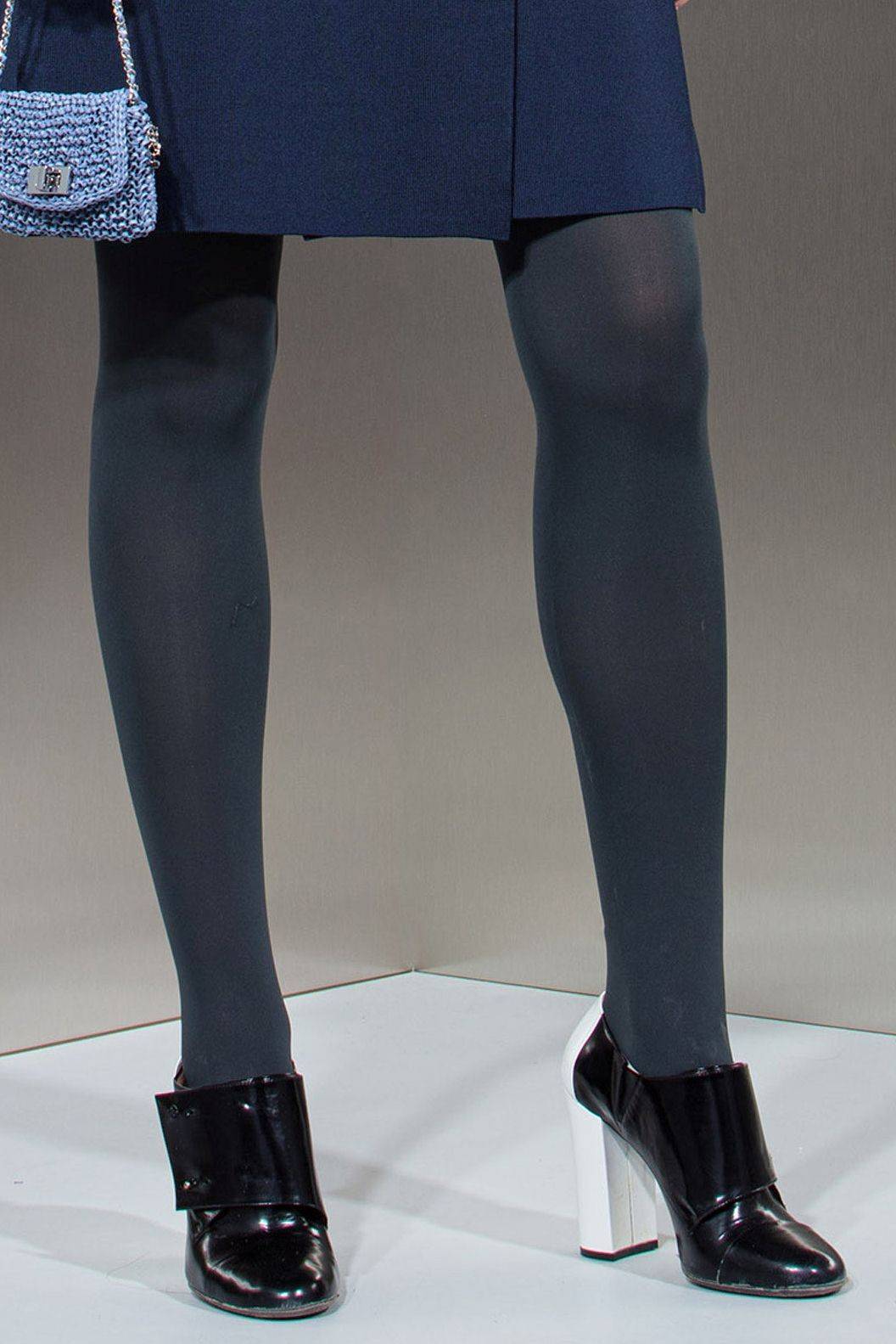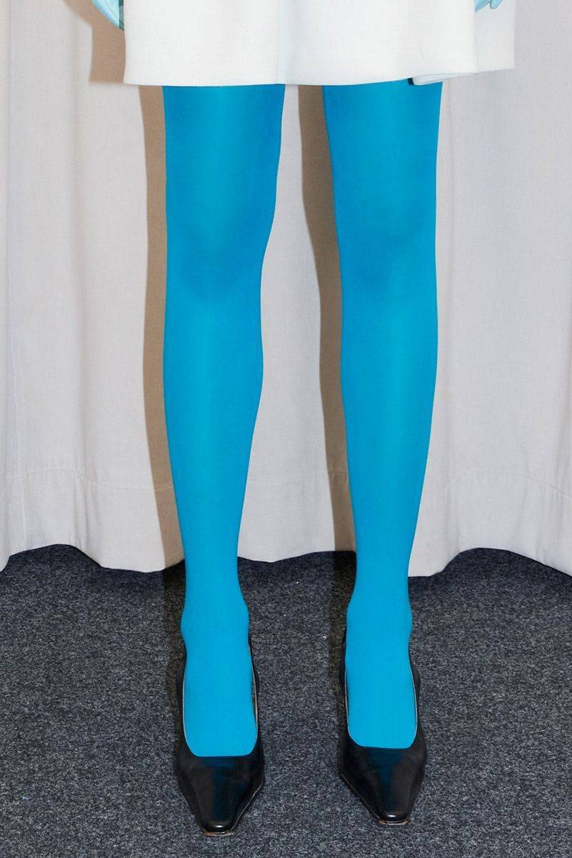 Тёмные серые, коричневые и синие оттенки не уступают в универсальности чёрным колготкам. Они выгодно внедряются не только в монохромные луки, но и с контрастной игрой. Стильным приемам учат мастера Anteprima, Cinq a Sept, Marine Serre и Matty Bovan.