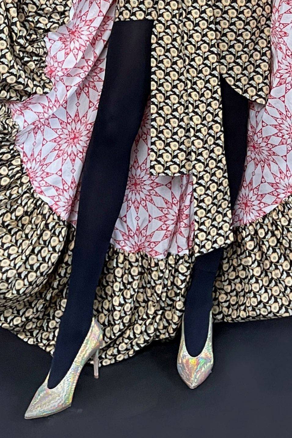 - Оденьте красные колготки с цветочной юбкой и ботильонами.