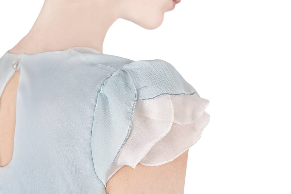 Креп-шифон — универсальный текстиль, применяемый в пошиве женской и детской одежды и декорирования интерьера. Многослойные конструкции, рюши, оборки не утяжеляют изделия.