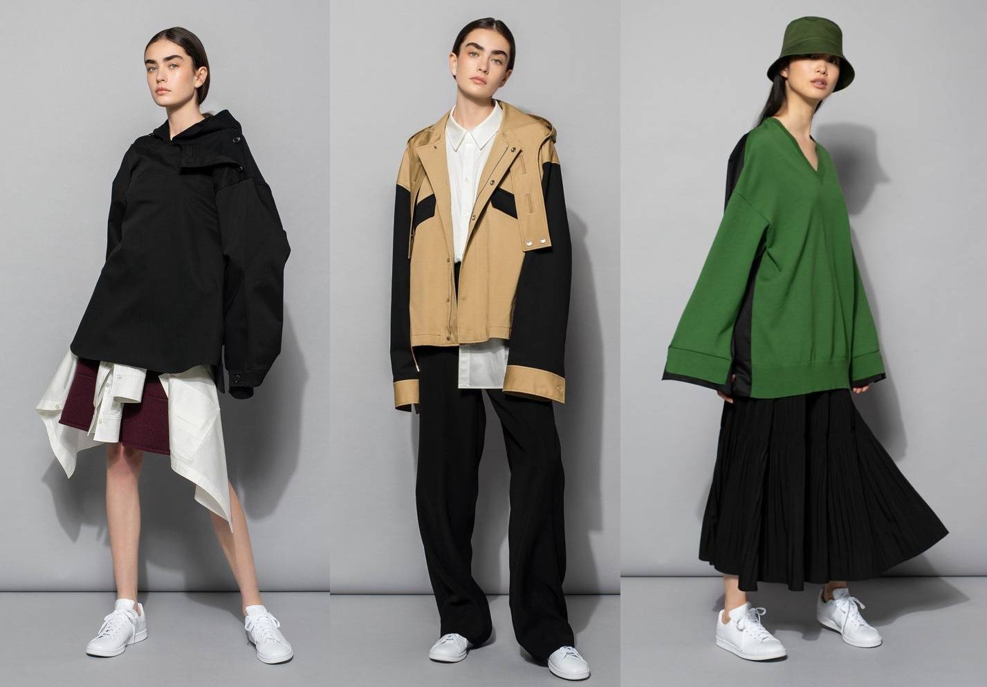 Чёрно-белый стиль от Sacai только усилен модной юбкой, которая держится на сторонах и сзади. Спереди же брюки раскрыты. А у Off-White юбка ниспадает только на одной стороне, словно хвост на боку. Кусок ткани в сборку наложен в два слоя, что придаёт дополнительный объём силуэту.