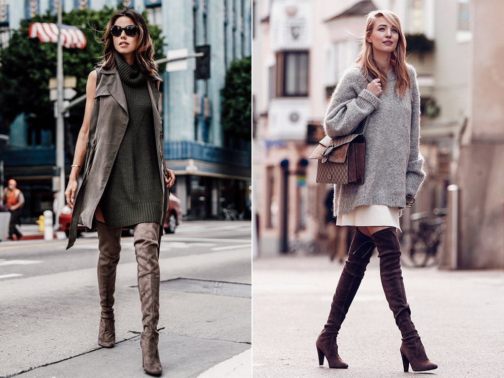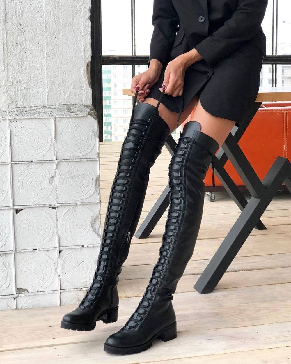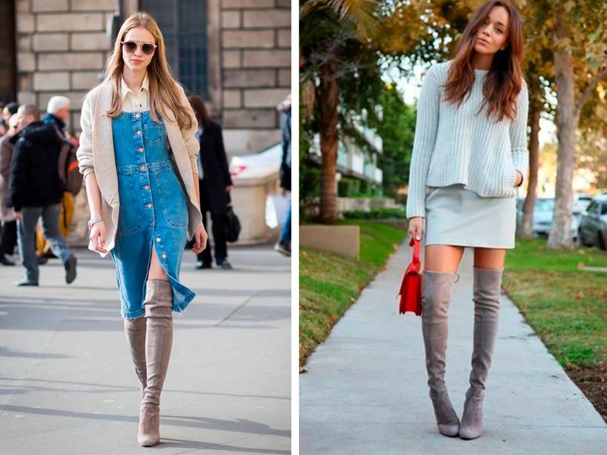 Интересны очень высокие ботфорты, которые заканчиваются на середине бедра. Это обувь не для повседневного образа. Они сочетаются с небольшим количеством одежды. К ним подойдут классические шорты, юбка-шорты, короткая юбка, вязаное платье или удлиненный свитер