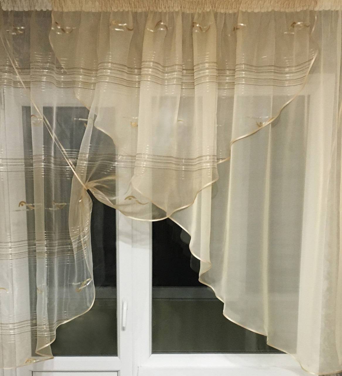 Длина шторы должна зависеть от предназначения. Так, для кухни лучше выбрать укороченную до подоконника, а в просторную гостиную приобретите длинную штору с вышивкой, хорошо рассеивающую свет.
