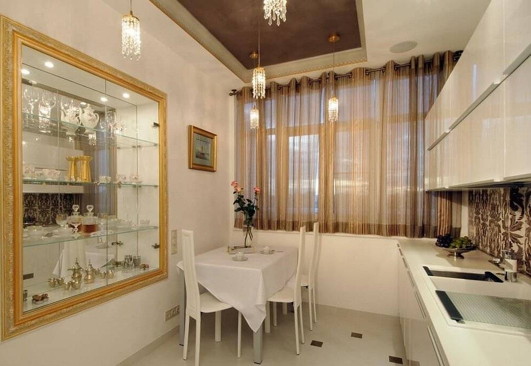 - Не покупайте модели в пол. На кухне актуальнее смотрятся светлые и короткие шторы. В интерьере столовой хорошо будут смотреться длинные полотна.