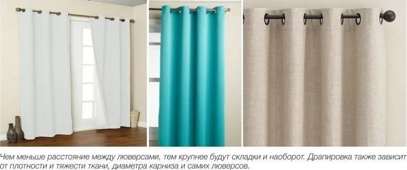 Количество используемых люверсов является одним из важнейших показателей для получения максимально красивых штор. Оптимальным расстоянием между люверсами считается 15 – 20 сантиметров. И чем крупнее будет данный промежуток, тем больше будут складки.