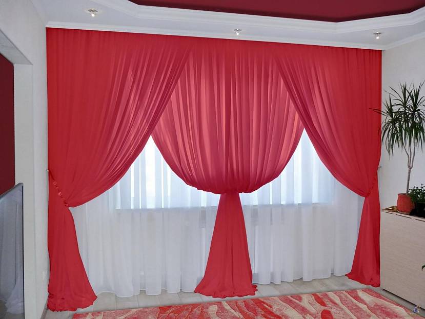- На больших окнах хорошо смотрится короткая вуаль яркого цвета в сочетании с длинной плотной шторой.