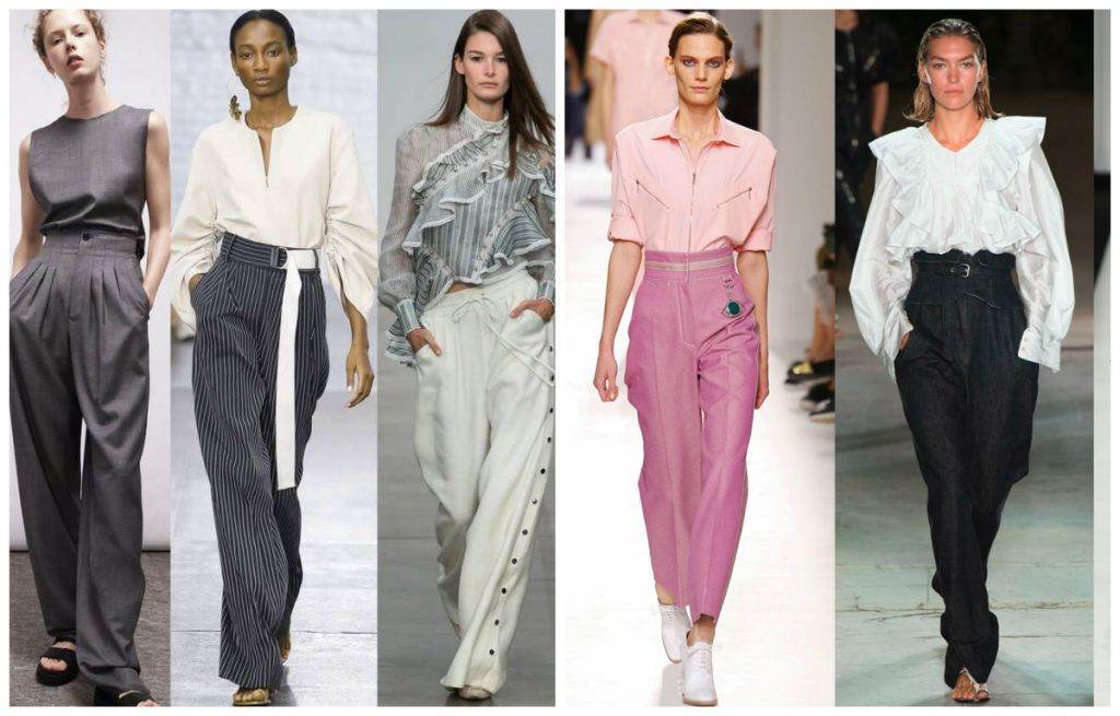 Если рост женщины до 165 см, с палаццо будут сочетаться полуоблегающие майки, свитшоты, свитера, рубашки, туники, блузы, заправленные поясом. Холодная погода, — приемлемо пальто, куртка или тренч, одежда, имеющая жёсткую посадку и прямой крой. К ним подойдёт обувь на высокой танкетке. Как правило, если одна из вещей комплекта с принтом, вторая должна быть однотонной и отражающей оттенок ткани с узором.