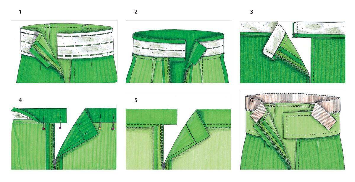- Присоединить поясную деталь, слегка растягивая основное полотно на уровне талии. В пояс можно вставить укрепляющую корсажную ленту.