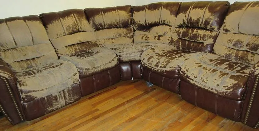 - Повреждение ткани. Большинство бытовых чистящих средств, которые продаются в магазине, содержат кислородный отбеливатель. При неправильном температурном режиме или концентрации, он может обесцветить или повредить ткань. Если слишком долго держать такой состав в нанесённом на мебель состоянии, то он может стать причиной ожога ткани. Поэтому не стоит использовать универсальные средства без какого-либо опыта.