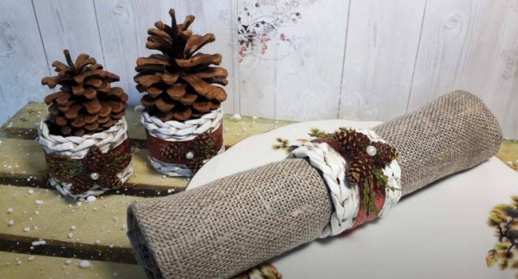 Идея заключается в применении плотных картонных или пластиковых трубок, оставшихся от использованной упаковочной пленки. Такая основа распиливается на кольца равной высоты и аккуратно, с последовательным прилеганием обматывается джутом. Затем клеевым пистолетом наносится нехитрый узор выбранной тематики и после высыхания покрывается металлической эмалью. Вариант подходит для рождественских и пасхальных застолий, отлично гармонирует со свечами, еловыми ветками, узорами серебра и позолоты.