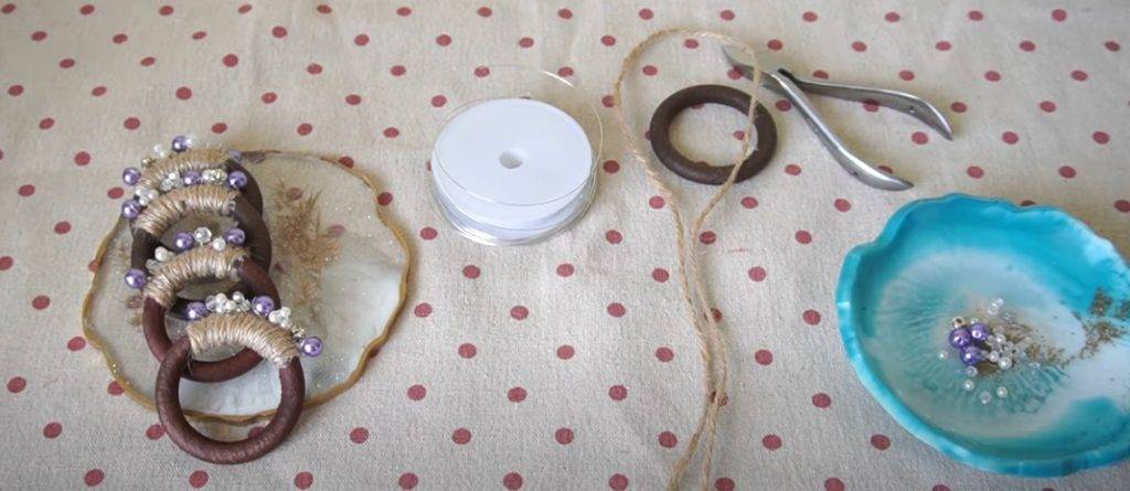 Этот пункт напрямую зависит от того, из чего будет сделан держатель. К примеру, если вы просто повяжете красивую атласную ленту вместо кольца, потребуются только кусочки этого материала. А для создания изделия из бусин или вязаных моделей, потребуются ножницы, проволока, качественные нитки, крючок или спицы.