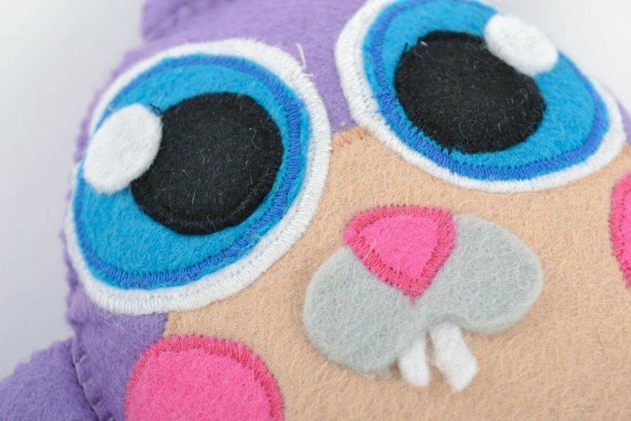 Можно также создать глазки из фетровых кружочков разных размеров. Достаточно просто вырезать заготовки и склеить или сшить их между собой, а потом присоединить к готовой вязаной игрушке.