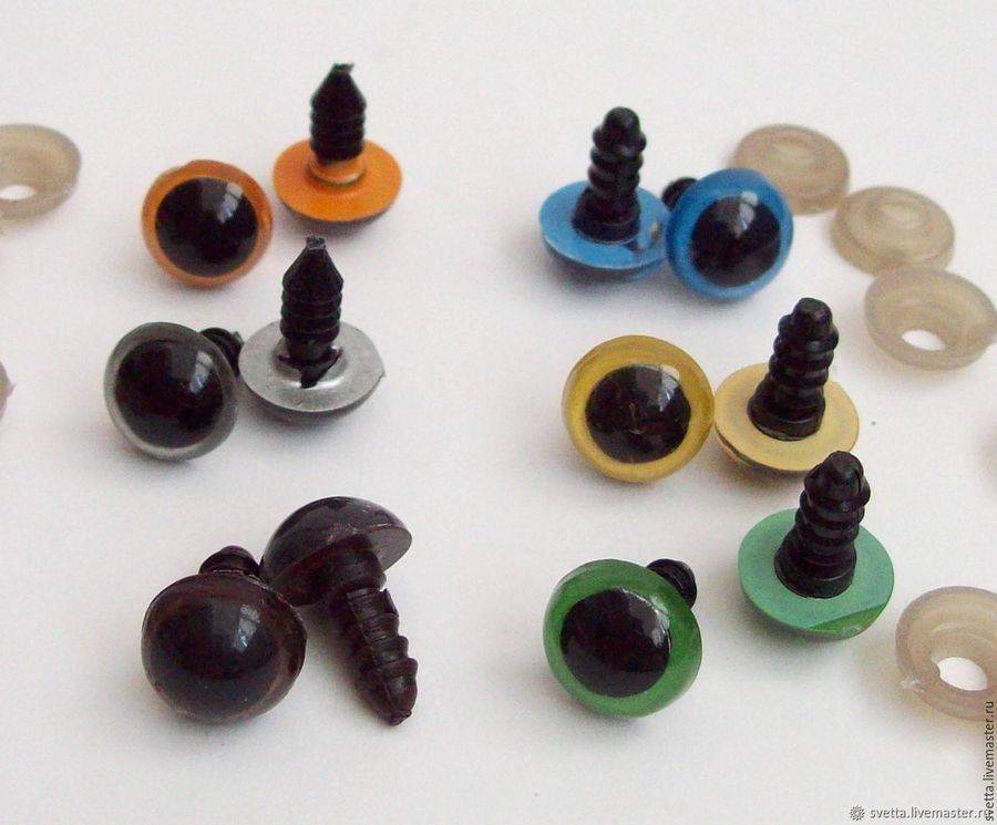 Глаза из пластика бывают с винтовым креплением. Они крепятся на пряжу и являются безопасными для маленьких детей.