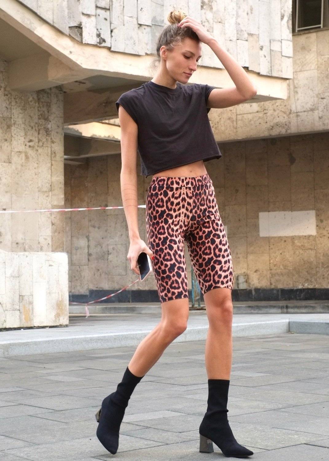 Леопардовые: такие велосипедки давно перестали считаться дурным вкусом. Главное — уметь их правильно сочетать. Например, с винтажной блузкой белого цвета, добавляем ремень с цепями, чёрные мюли на каблуке и очки в ретро — стиле. Всё! Получаем супермодный лук.