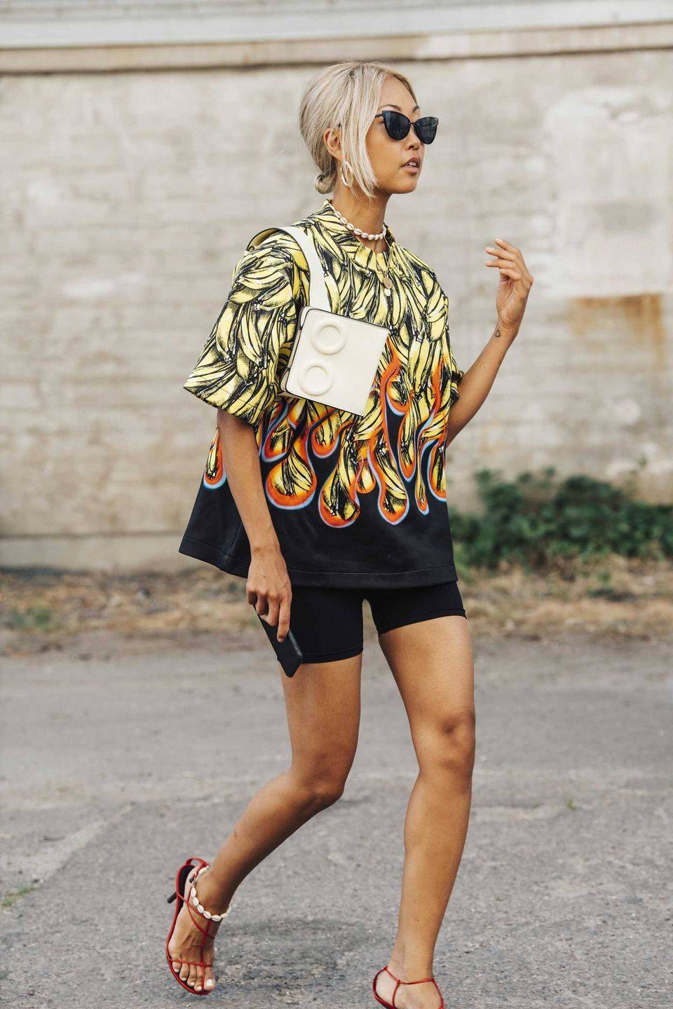 С цветовой палитрой этим летом дизайнеры так и не определились: одни по-прежнему голосуют за пастель и нейтральные оттенки, другие — за неон, буйство красок и узоров. Мы (вместе с Nanushka) — за всё сразу, поэтому советуем носить велосипедки с принтом вместе с нежным платьем светлого оттенка и сандалиями в тон. Панама или кепка впрочем тоже лишней не будет: летнее солнце может быть коварным.