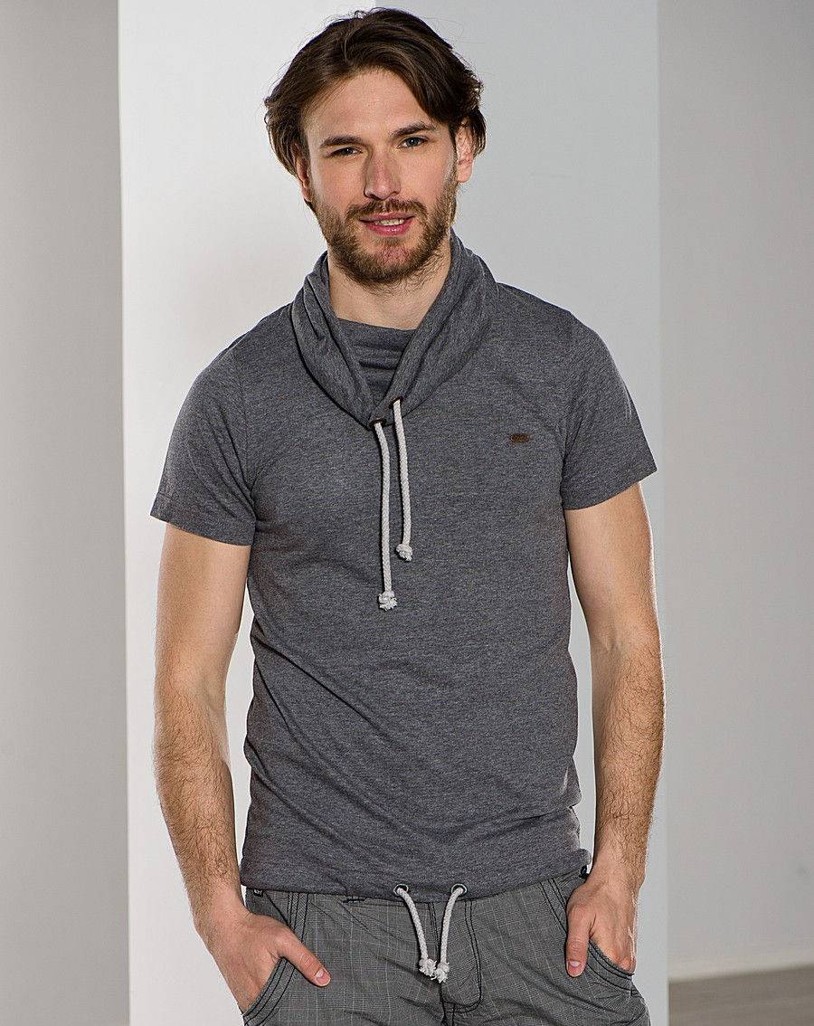 Популярны удлиненные мужские футболки с капюшонами, длинными воротниками типа «труба». Чтобы было удобно надевать облегающие модели, используются разные вырезы горловины. Или оригинальные застежки (на молниях, пуговицах, кнопках), располагающиеся по центру горловины или сбоку.