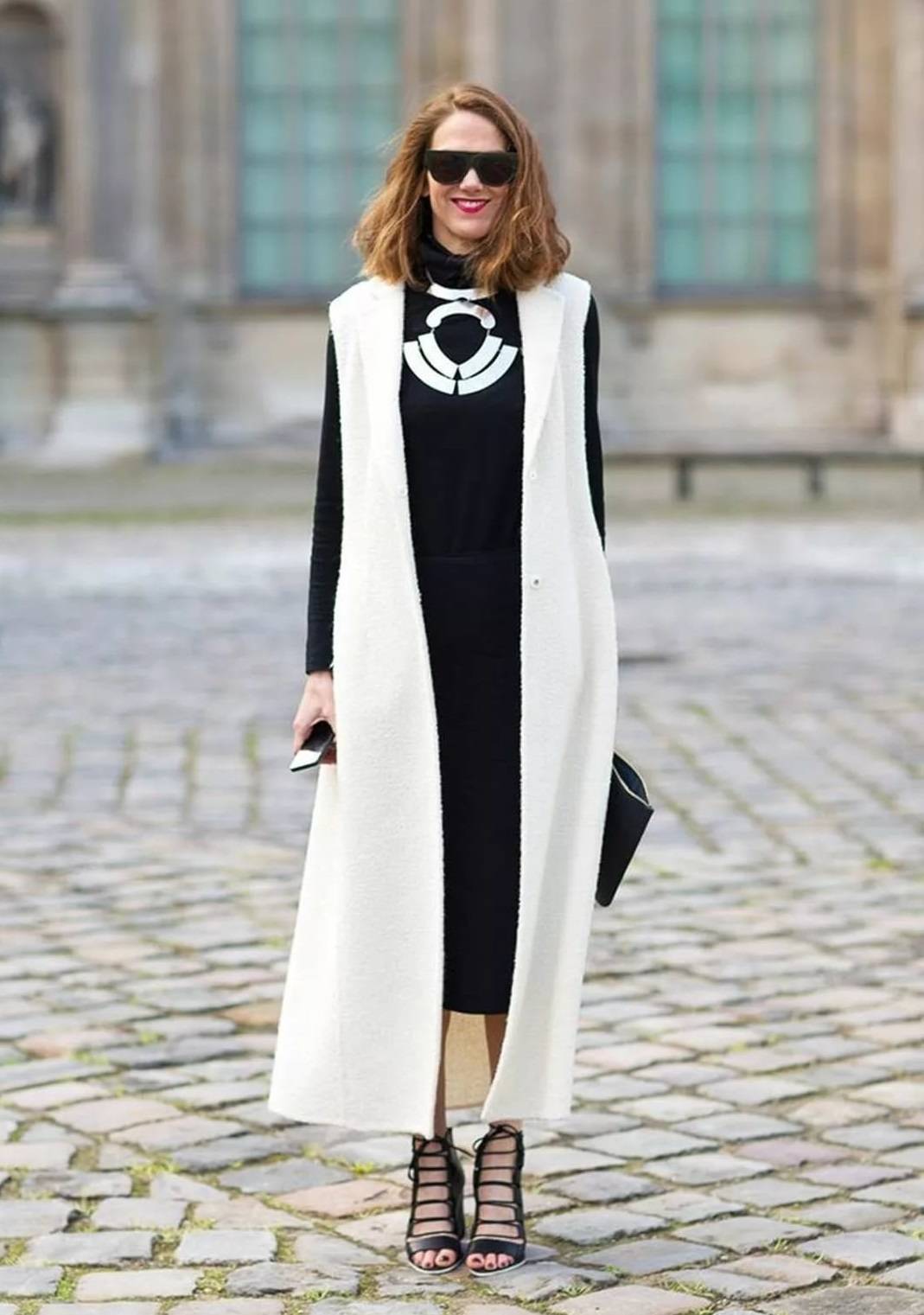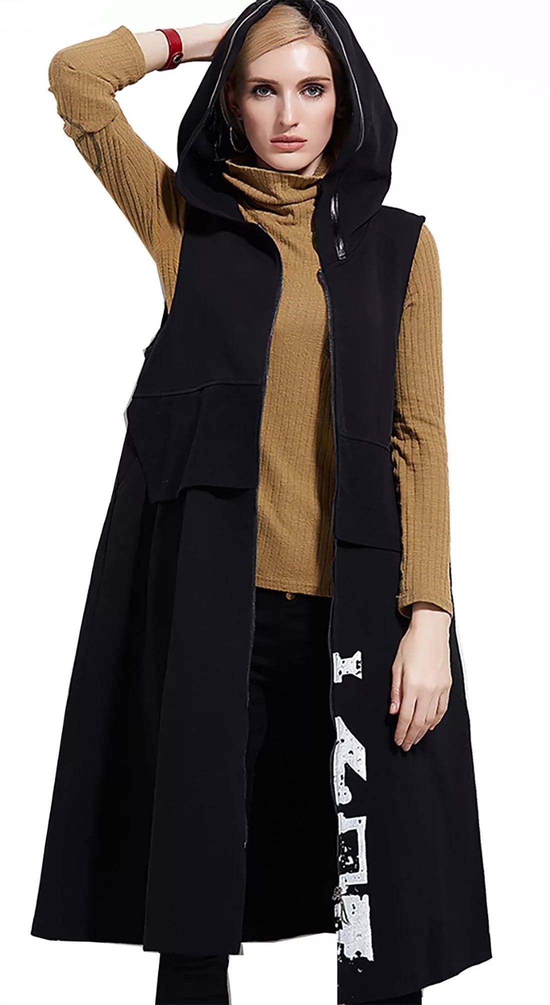 Брюки классические, зауженные, карго, кюлоты, джинсы составляют гармоничные комплекты с пальто без рукавов. На основе лаконичных трапециевидных или облегающих платьев длиной до колен также создают стильные ансамбли. Юбки миди и макси нередко нарушают пропорции фигуры. Исключение составляют нарядные модели верхней одежды в пол, которые накидывают на вечерние туалеты.